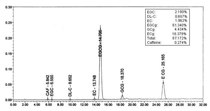 Catechinen, de belangrijkste componenten van thee polyfenolen, bestaan uit EGC, DL-C, EC, EGCG, GCG en ECG. Deze verbindingen vertonen farmacologische eigenschappen zoals: